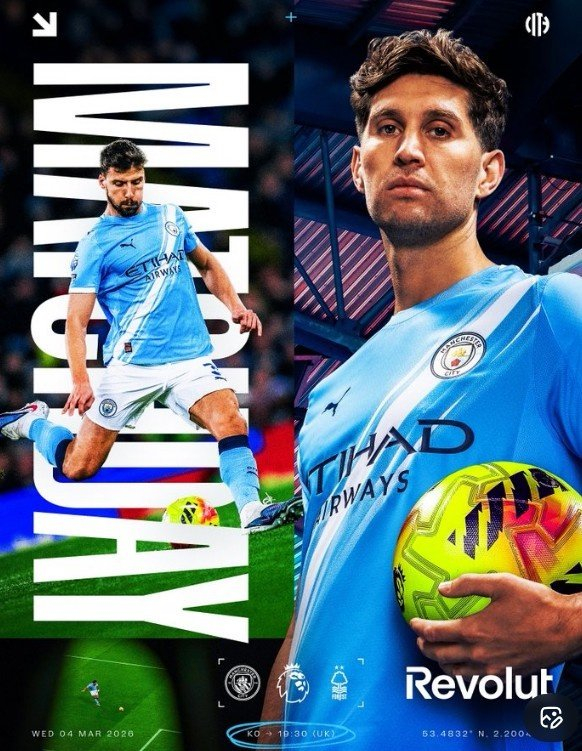 #曼城发布对阵诺丁汉森林海报# 曼城官方晒出海报为本场比赛预热,海报中斯通斯、鲁本·迪亚斯两名后卫担纲主角。在目前的积分榜上,曼城少赛一场以5分之差位列次席,而诺丁汉森林只领先降级区2分。